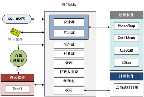 部门:设计部门、营运部、生产部、财务部、工厂、仓库、行政人事部
